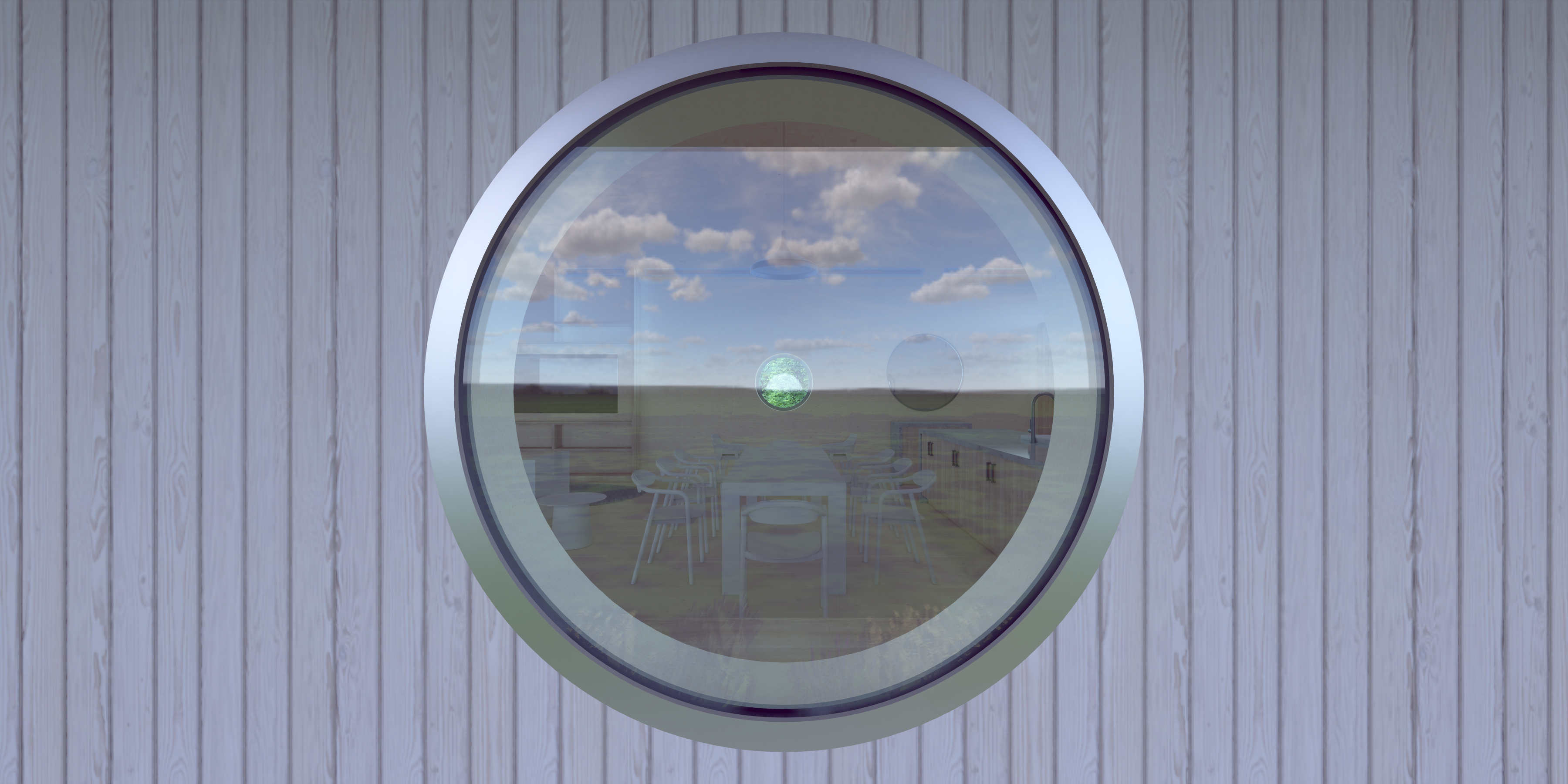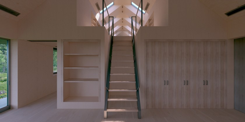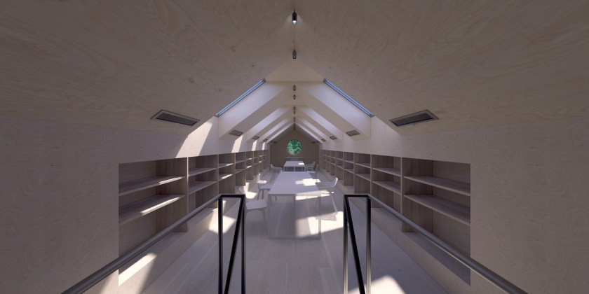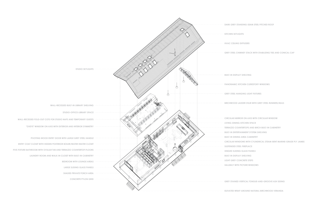 From the living space, a ladder stair leads up to an attic-like linear studio, office, and library space flanked with wooden shelving inset into its long walls. This space leads to a large circular window centered under the southern gable end, where a niche of two small cots fold out from the side walls to accommodate guests. This “oxeye” window follows a compositional lineage that uses rounded or “soft-edged” shapes to accommodate openings within the triangular canvas of a gable end or pointed arch façade element. Within the interior space of the Cabin, the window emphasizes the studio-office-library’s axial symmetry. Four pairs of skylights line the workspace of this attic area, and an additional pair adds to the natural light of the kitchen-dining area’s northerly clerestory and lateral windows. These circular windows are deployed at the rectilinear east and west facades of the communal spaces, and they serve to playfully “soften” both the atmosphere of the interior space and the rigidity of the building’s exterior composition.