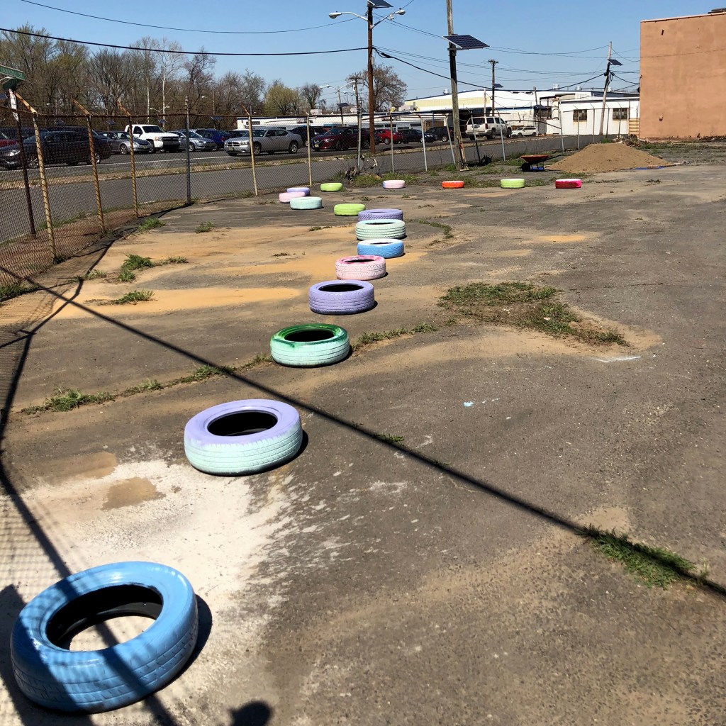 A snake of colorful tire planters circumscribing informal gathering space (topsoil delivery in background; fertilizer bin not pictured)