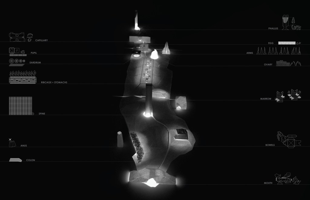 Each architectural figure on the island acts as a specific organ or body part within the greater corpus of the island. The island, and its architecture, becomes the body of the last corporeal Human, and exists to tell the story of its Self. We, as Humans, evolve into architecture, using architecture.