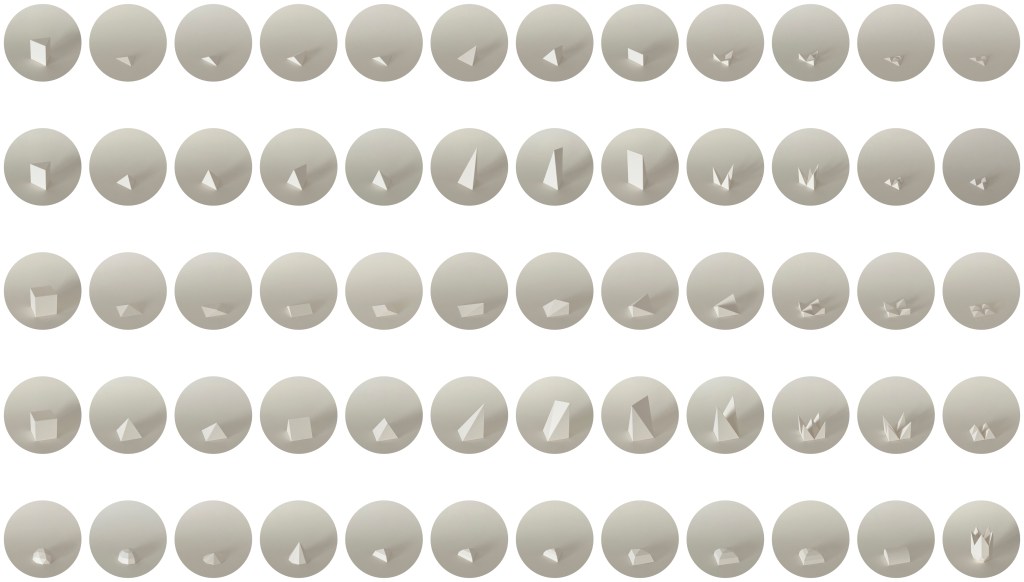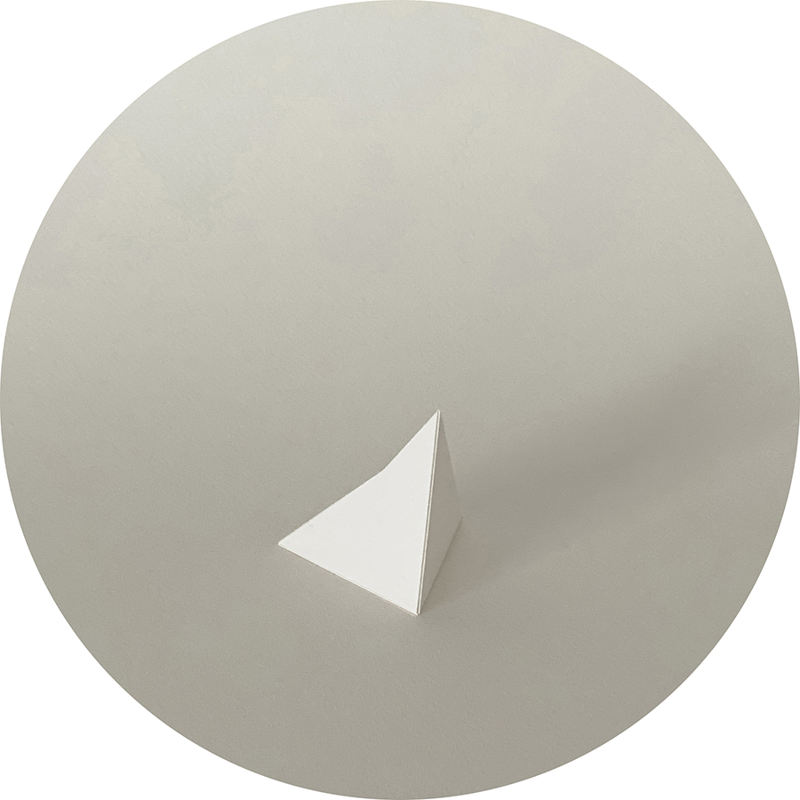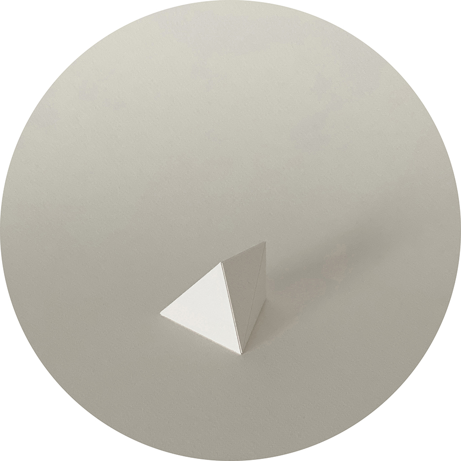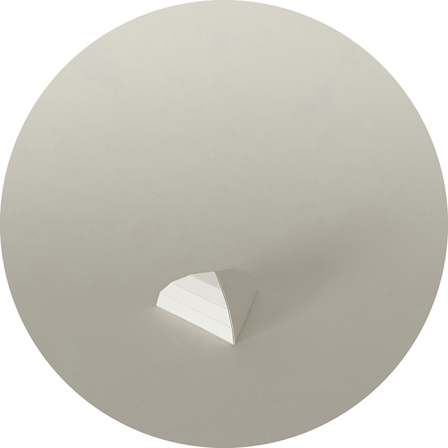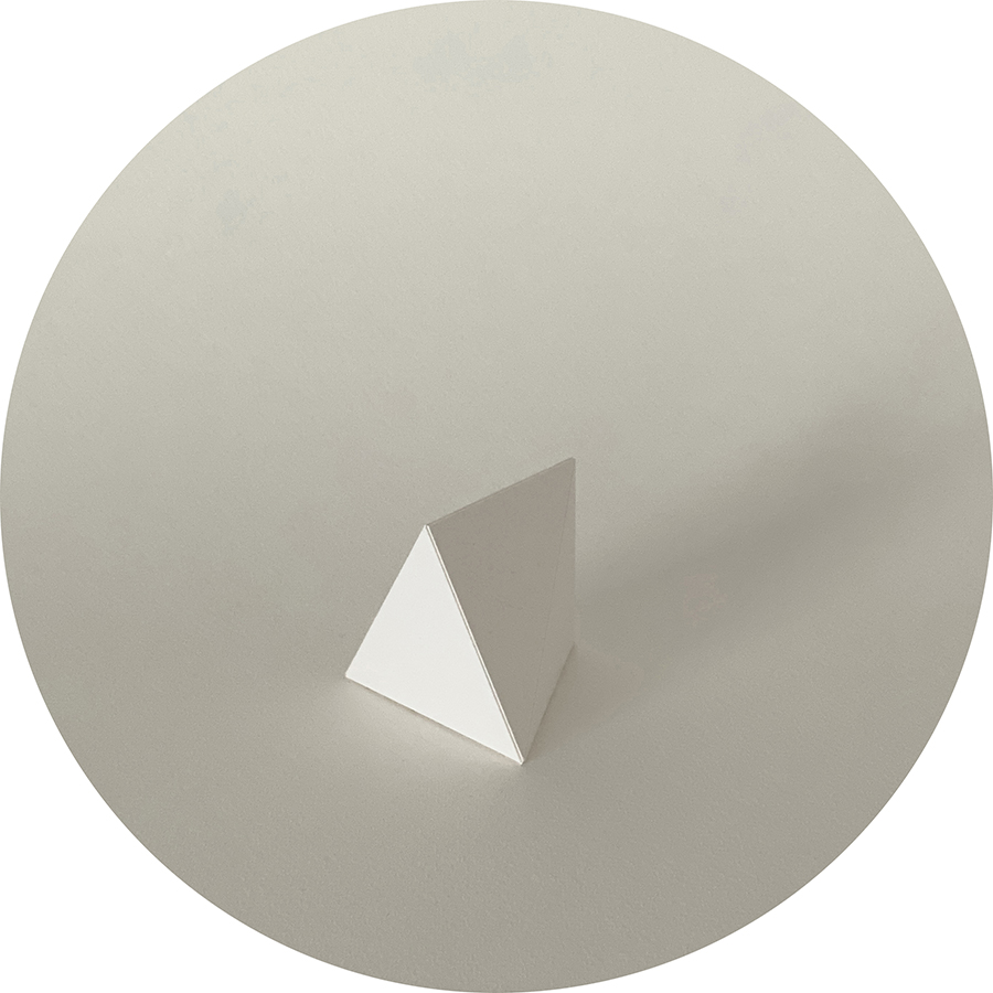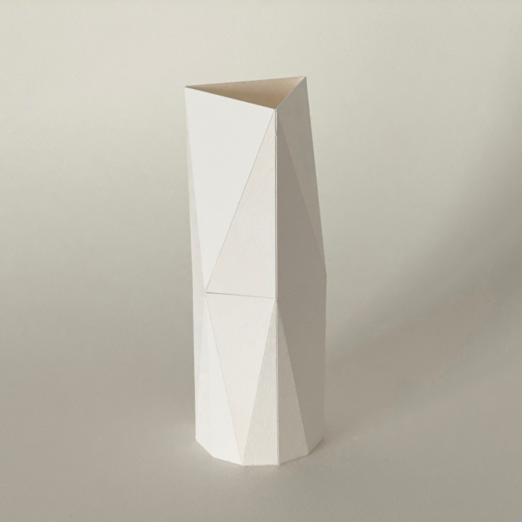 This morphological series of Euclidean forms is constructed from developable surfaces of hand cut, scored, and folded paper. These models have two basic components, “bodies” and “heads”: (1) “bodies” are shape-solids with extruded bases of (primarily) equilateral triangles and squares, and (2) “heads” are formal caps consisting of (primarily) 30-60-90-degree sloped facets.