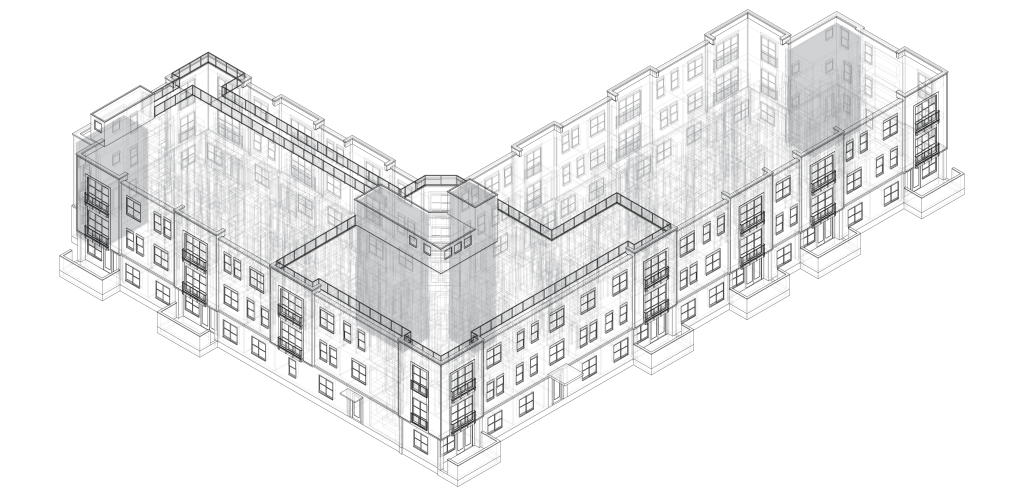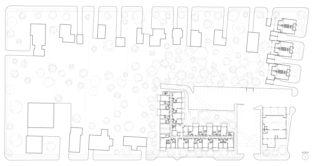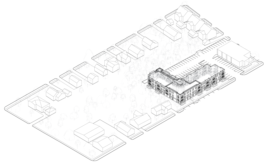 A private client’s mixed-use residential development with new apartment building, duplex row, and renovated office space, sited within an upper-middle class suburban locale. The design for the apartment building is highlighted herein.