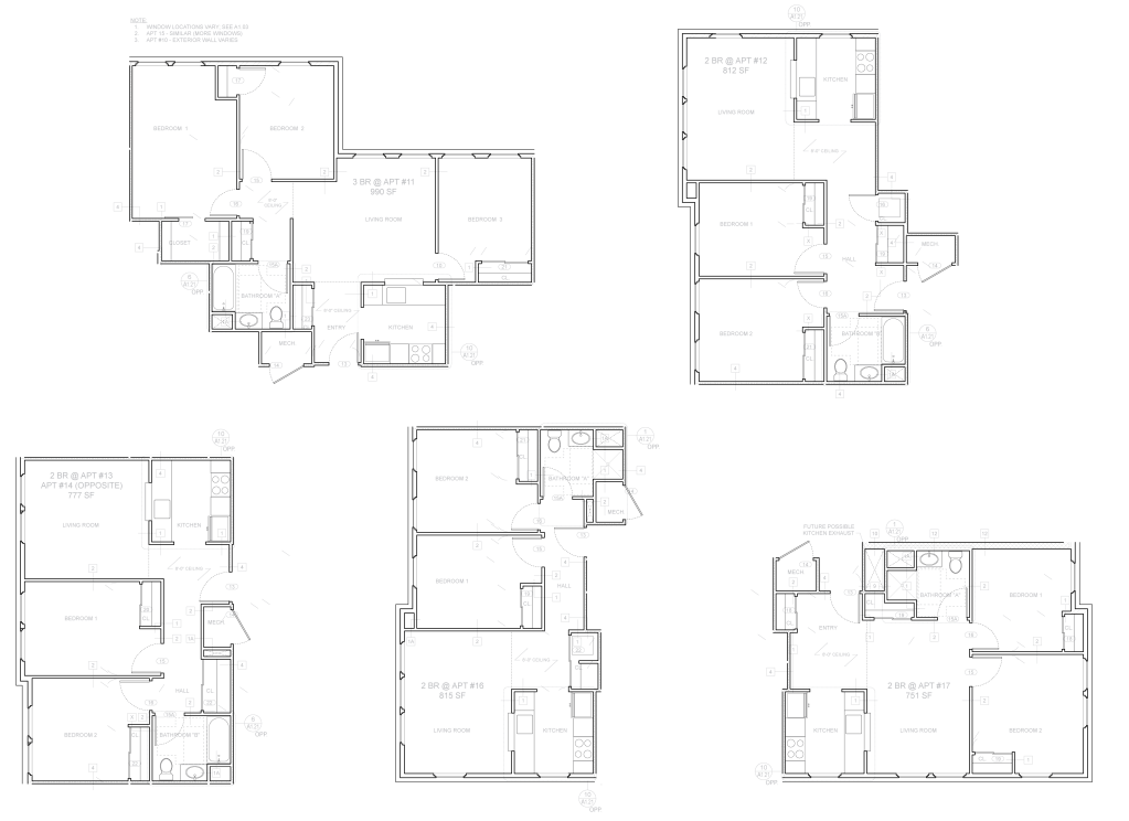 The 17 apartments consist of nine one-bedroom units, seven two-bedroom units, and one three-bedroom units.