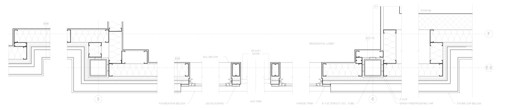Constructed within a stilted market economy, this project is subject to the complications of the contemporary architectural addiction to the “Quadrivium Industrial Complex” of steel, concrete, glass, and plastic, as described by Mark Jarzombek. As with most American architecture built during the late 2010s and early 2020s, the project’s realization was impeded by exigencies of COVID-era issues with onsite construction, offsite manufacturing, US tariffs on Chinese goods and raw materials, and additional global supply chain bottlenecks. These forces clashed with a persistent mandate from client and contractor for value engineering and cost optimization. Working within these budgetary constraints, we continued to advocate for the most durable and hygienic built-in kitchen and bathroom materials possible; to retain as many in-unit laundry stacks as possible; and for additional resident amenities (including bolstered acoustic insulation, substantial HVAC systems, and energy-efficient wall and window assemblies). Throughout this process, our primary concern was comfort and habitability for the occupant — our foremost constituent.